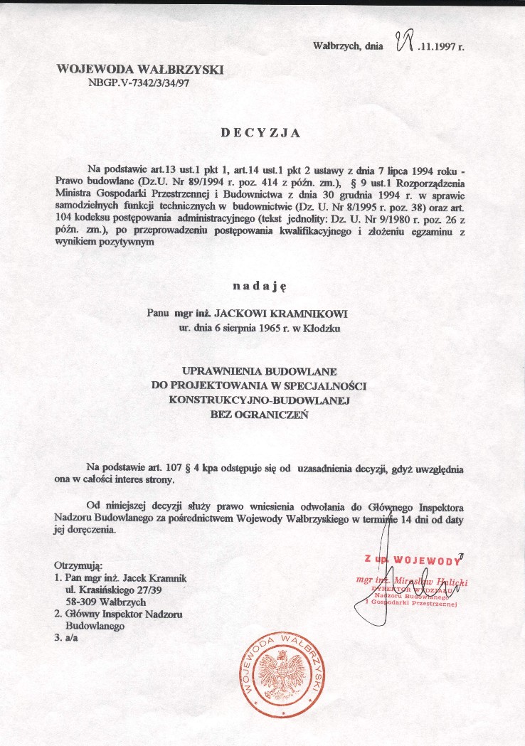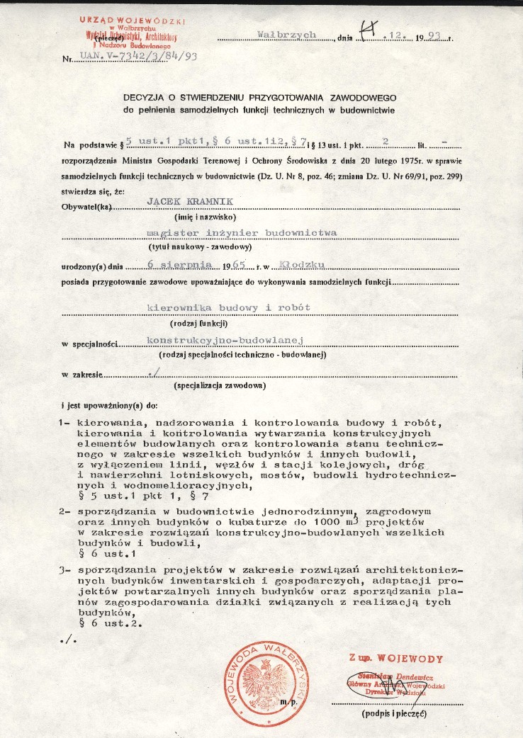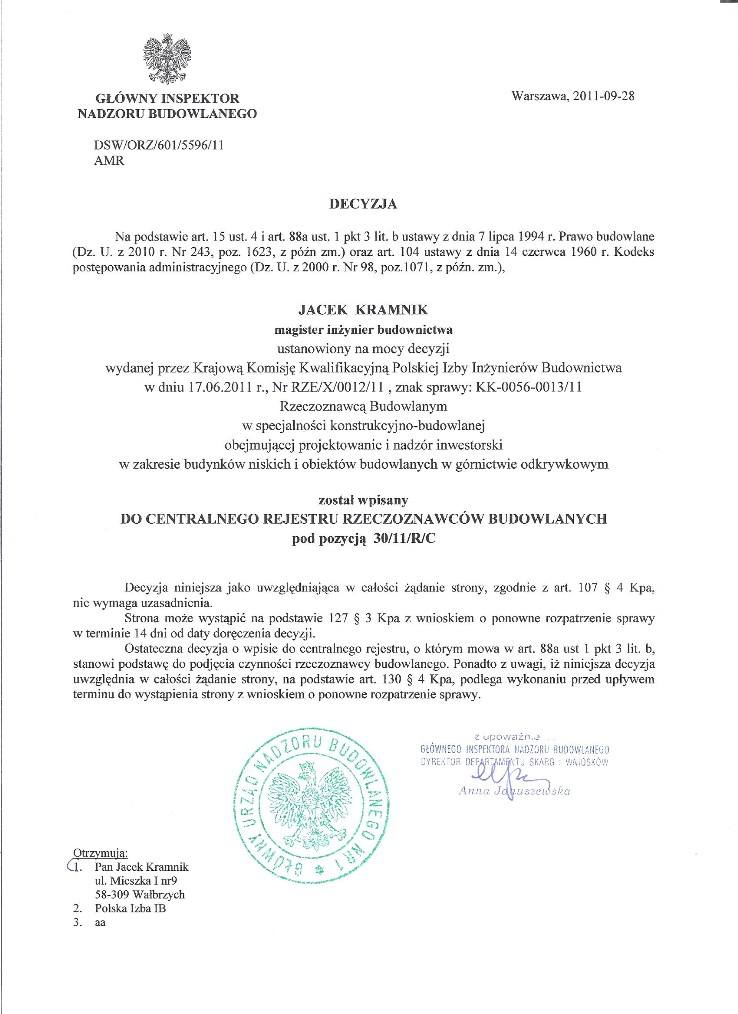 Decyzja o wpisie do Centralnego Rejestru Rzeczoznawców Budowlanych w specjalności konstrukcyjno-budowlane