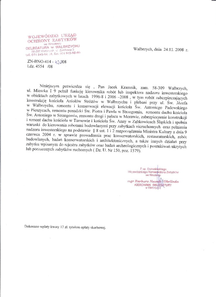 Zaświadczenie o posiadaniu kwalifikacji do kierowania robotami budowlanymi przy zabytkach nieruchomych oraz pełnienia nadzoru inwestorskiego przy tych robotach